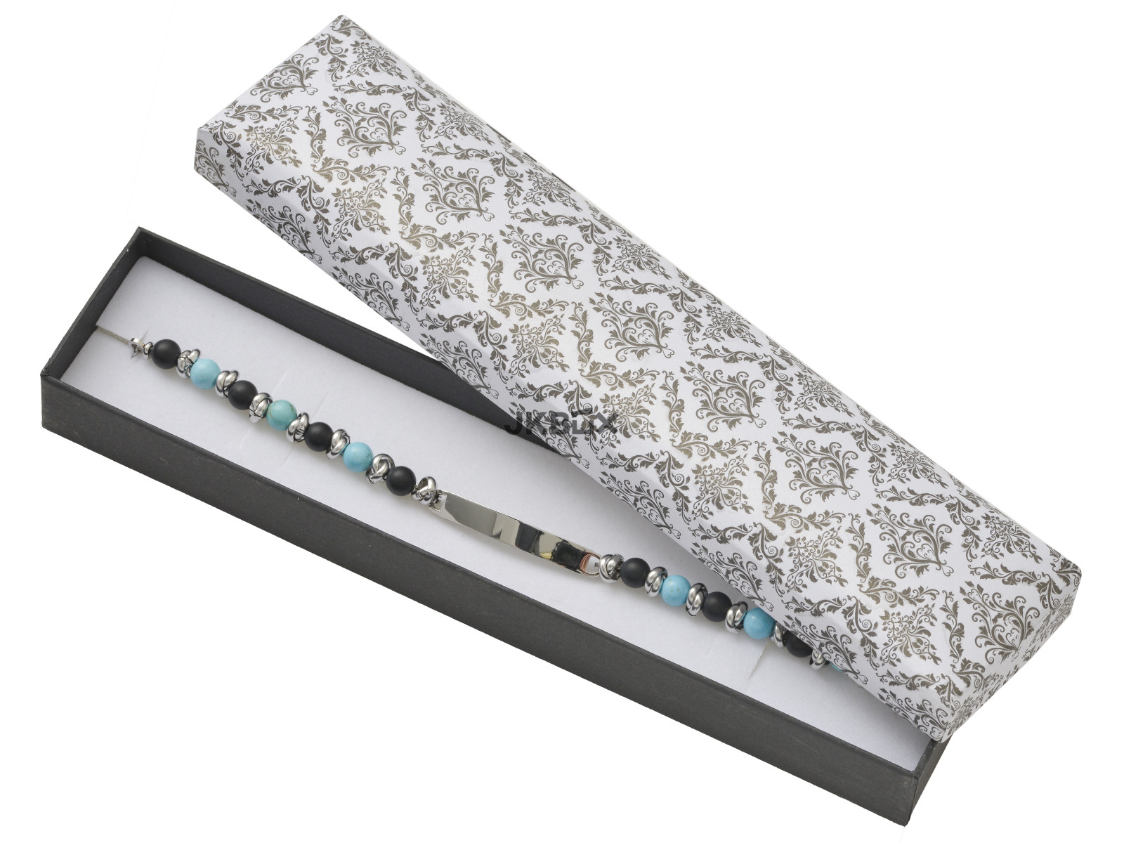 OPIS PRODUKTU - Biało-czarne papierowe pudełko z grafiką w czarne ornamenty, przeznaczone na bransoletkę. Wieczko pudełka jest delikatne i miękkie tworzy efekt soft - touch. Rozmiar: 45x200x25 mm KR-9