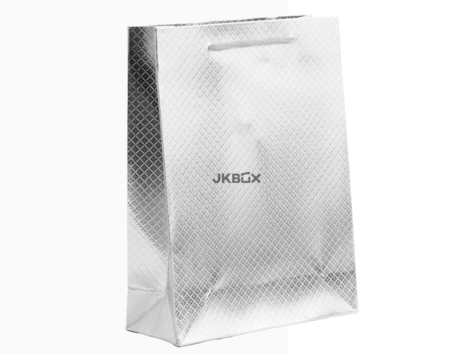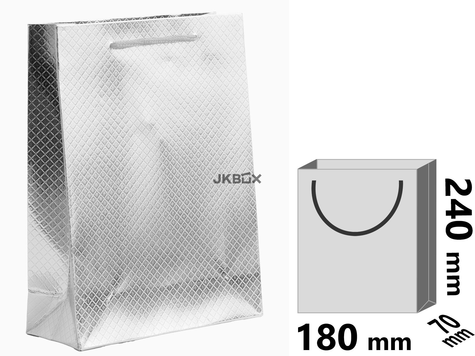 OPIS PRODUKTU - Duża papierowa torebka w kolorze srebrnym o pikowanej strukturze. Uchwyt wykonany ze srebrnego sznurka. Rozmiar: 180x70x240 mm MK-10/AG