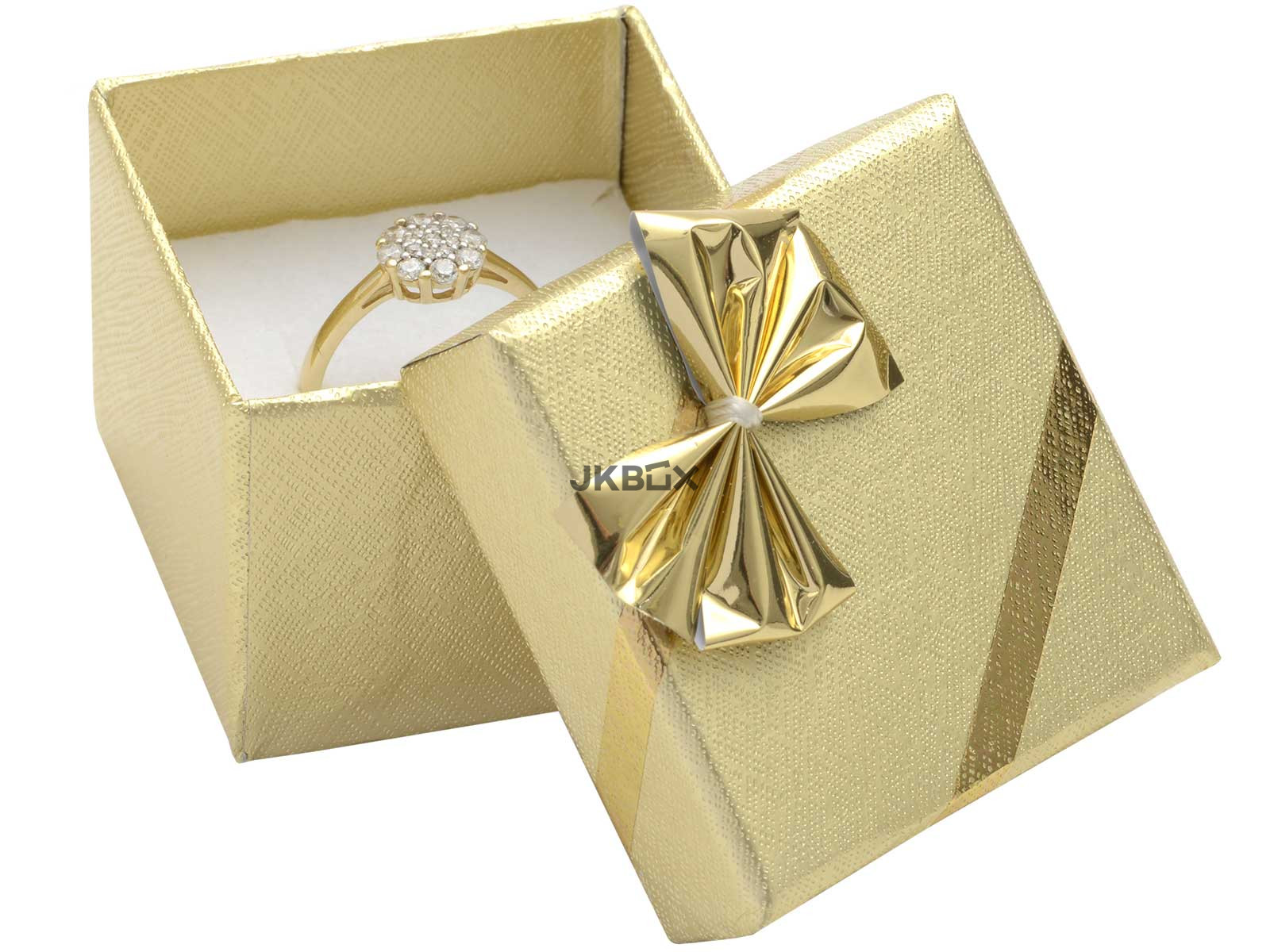 OPIS PRODUKTU - Złote papierowe pudełko z złotą kokardką, przeznaczone na pierścionek lub kolczyki Rozmiar: 48x48x32 mm SG-2/S/Au